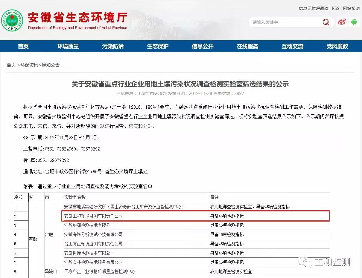 2019年1128日,安徽省生態(tài)環(huán)境廳網(wǎng)站發(fā)布了“關于安徽省重點行業(yè)企業(yè)用地土壤污染狀況調(diào)查檢測實驗室篩選結(jié)果的公示”,我司全項通過重點行業(yè)企業(yè)用地調(diào)查檢測能力考核。