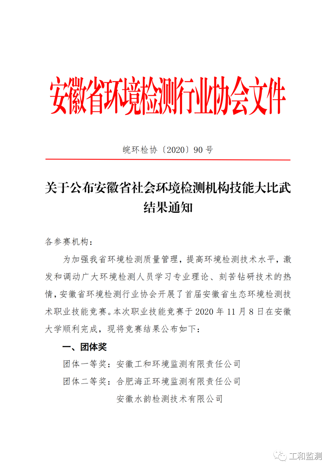 近日,我公司參加的首屆安徽省生態(tài)環(huán)境檢測技術(shù)職業(yè)技能競賽比賽結(jié)果公布。我公司榮獲本次比賽團(tuán)體一等獎;我公司員工程超、周開麗、任陽陽分別獲得個人綜合排名第5、第20、第27的優(yōu)秀成績,榮獲“骨干能手”、“技術(shù)能手”榮譽稱號。
