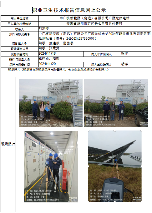 中廣核新能源(定遠(yuǎn))有限公司廣源光伏電站2024年職業(yè)病危害因素定期檢測報告(編號:24DQ63425758Q007)