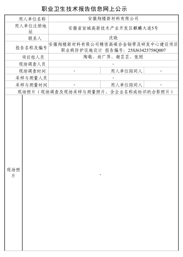 安徽翔樓新材料有限公司精密高碳合金鋼帶及研發(fā)中心建設(shè)項(xiàng)目 職業(yè)病防護(hù)設(shè)施設(shè)計(jì) 報(bào)告編號:25SJ63425758Q007