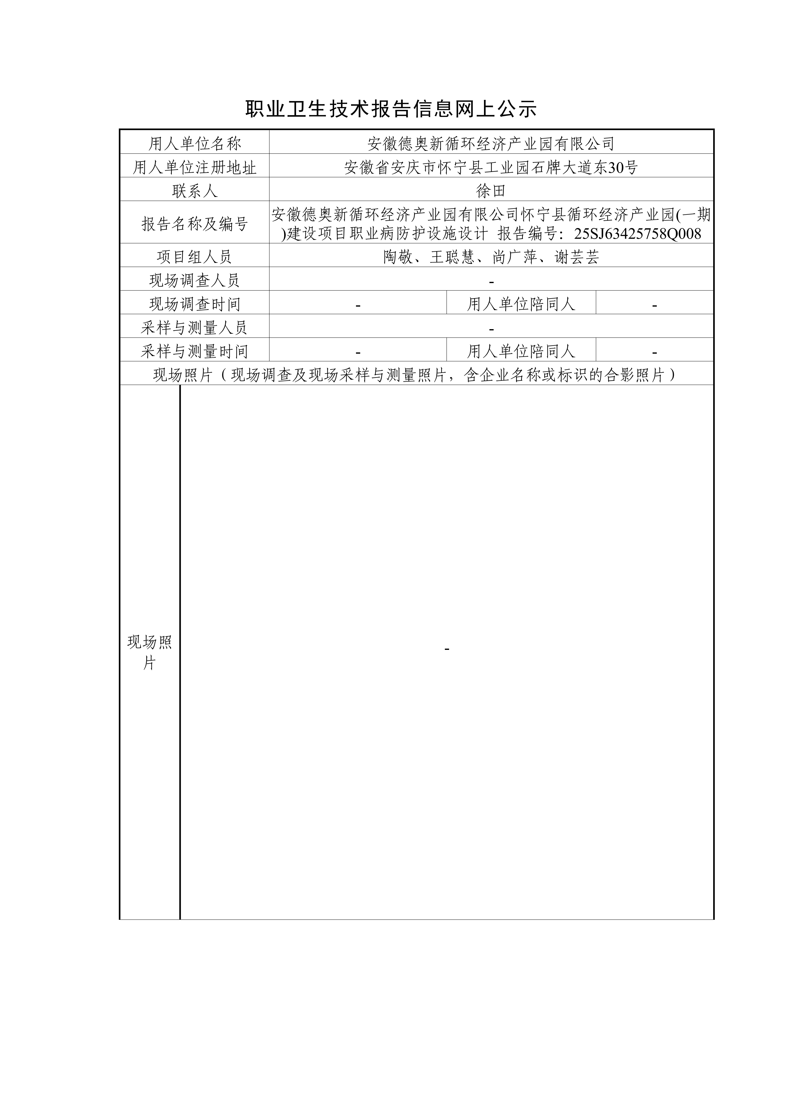 安徽德奧新循環經濟產業園有限公司懷寧縣循環經濟產業園(一期)建設項目職業病防護設施設計 報告編號:25SJ63425758Q008
