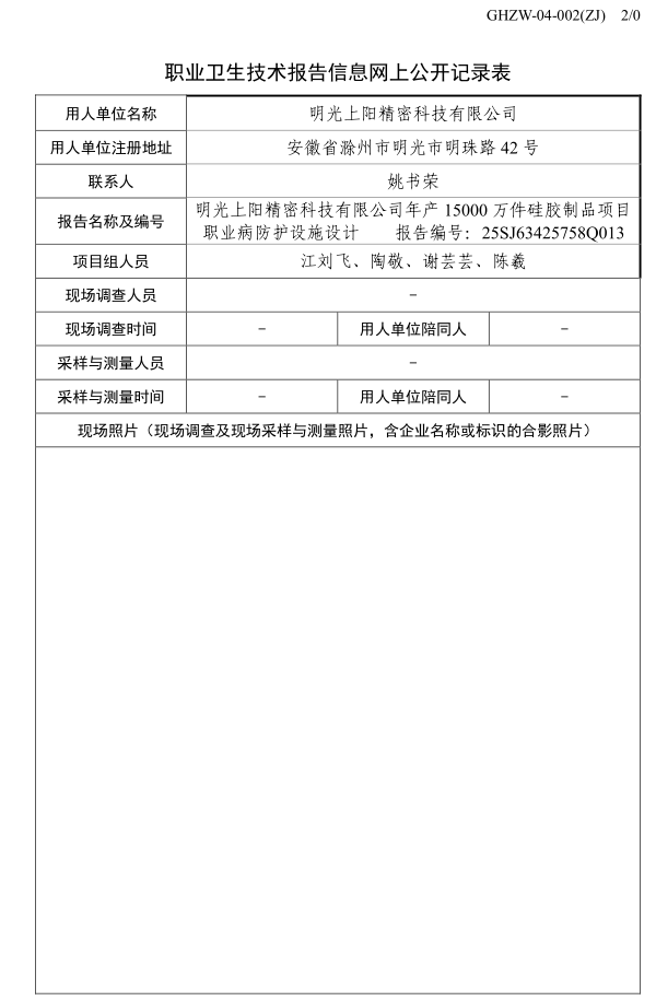 明光上陽精密科技有限公司年產15000萬件硅膠制品項目 職業病防護設施設計 報告編號:25SJ63425758Q013