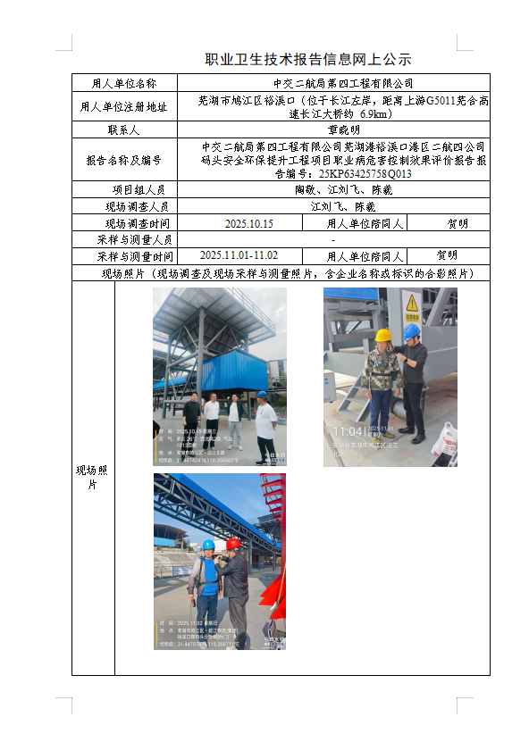 中交二航局第四工程有限公司蕪湖港裕溪口港區二航四公司碼頭安全環保提升工程項目職業病危害控制效果評價報告 報告編號:25KP63425758Q013